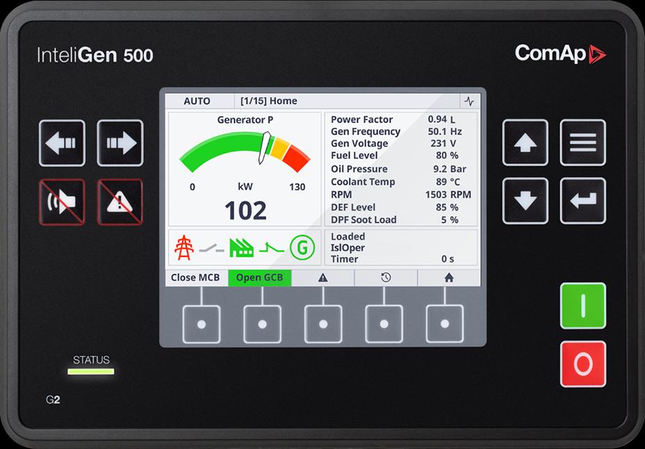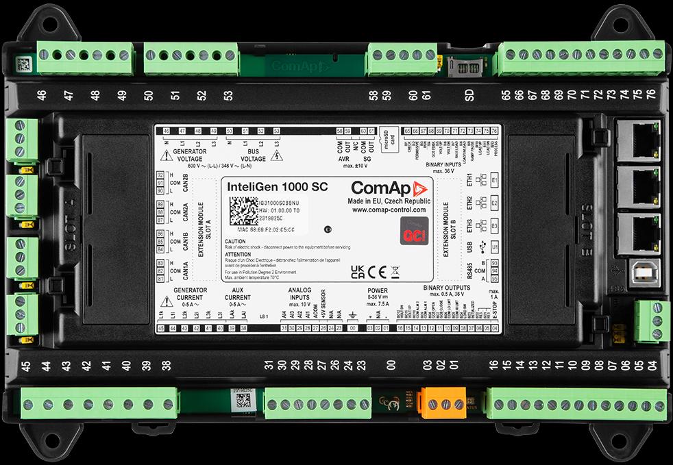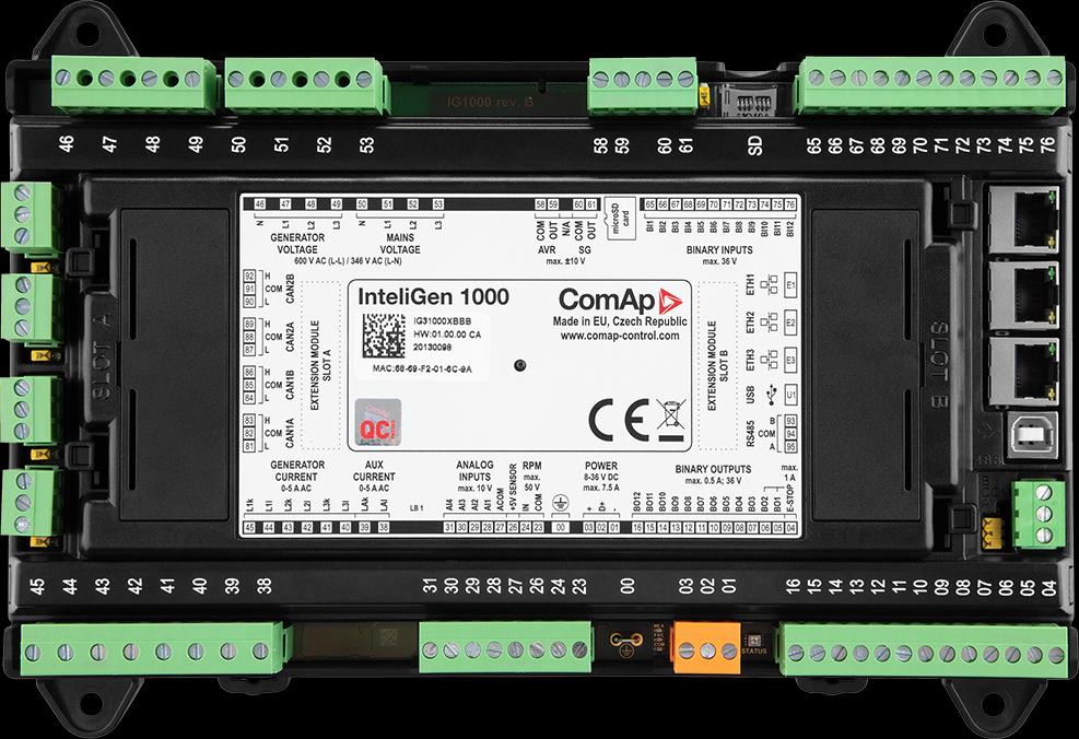 Az InteliGen párhuzamos generátorvezérlő család komplex, hálózatra kapcsolt vagy szigetüzemű többgenerátoros rendszerek irányítására készült, akár 32–64 vezérlő együttműködésével. A nagy pontosságú AC mérés, a fejlett szinkronizálási és terhelésmegosztási funkciók, valamint a beépített PLC és bővíthető CAN/I-O architektúra lehetővé teszi ipari és kritikus infrastruktúrák megbízható vezérlését. A többportos kommunikáció (USB, CAN, RS485, Ethernet), a redundáns kialakítási opciók és az ISA 62443 szerinti kiberbiztonsági megfelelés magas rendelkezésre állást és üzembiztos működést garantál.